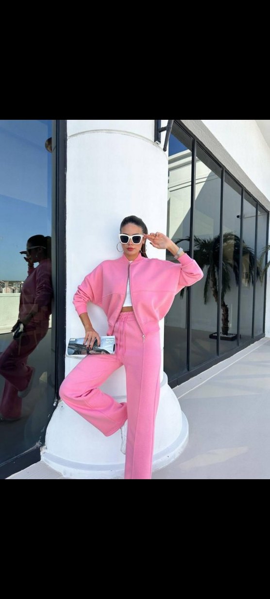 Pembe oversize kadın eşofman takımı, uzun kollu ve bisiklet yaka detaylıdır. Baskılı desenleriyle günlük şıklık sunar.