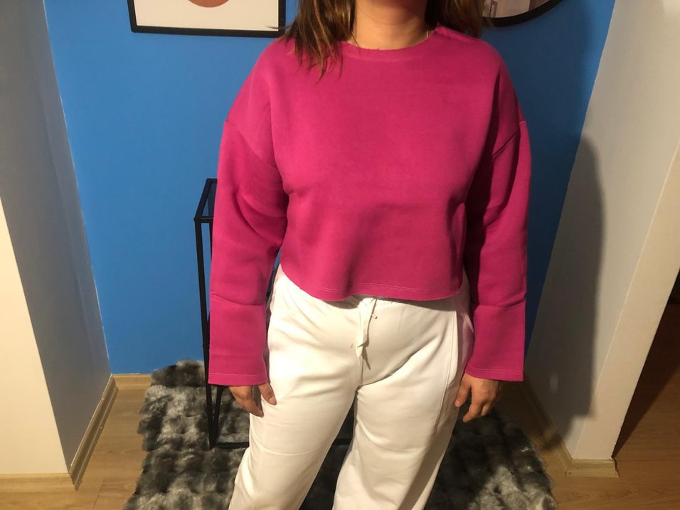 Pastel pembe renkte, yuvarlak yaka ve uzun kollu bu sweatshirt, bol ve midi boydadır. Yumuşak kumaştan üretilmiş olup günlük kullanım için rahat ve şık bir seçenektir.