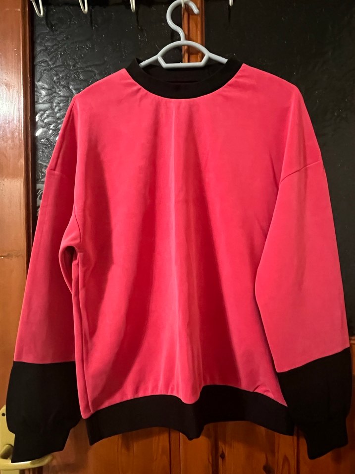 Yuvarlak yaka ve uzun kollu, yumuşak ve sıcak kumaştan pembe oversize kadın sweatshirt, siyah detaylarla rahat ve şık görünüm sunar.