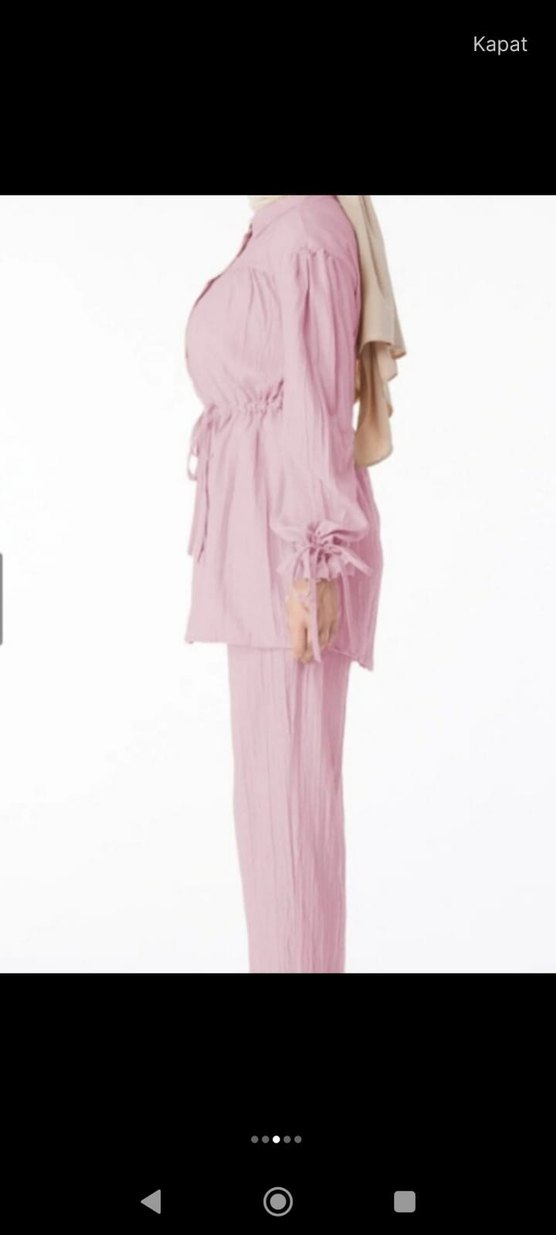 Pembe pastel renkte, keten kumaştan, uzun kollu ve pileli detaylı, oversize kesim kadın takımı. Günlük kullanım için uygundur.