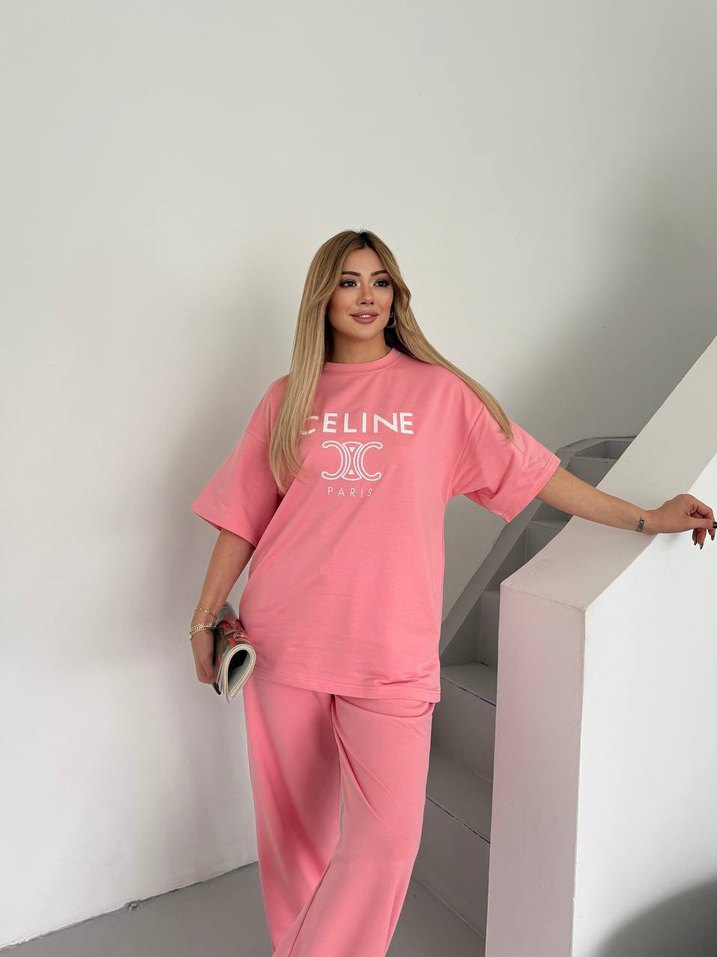 Pembe pastel tonlarda, oversize kesime sahip, kısa kollu ve bisiklet yaka pamuklu kadın takım. Baskılı detayları ve midi boyuyla rahat ve şık görünüme uygun.