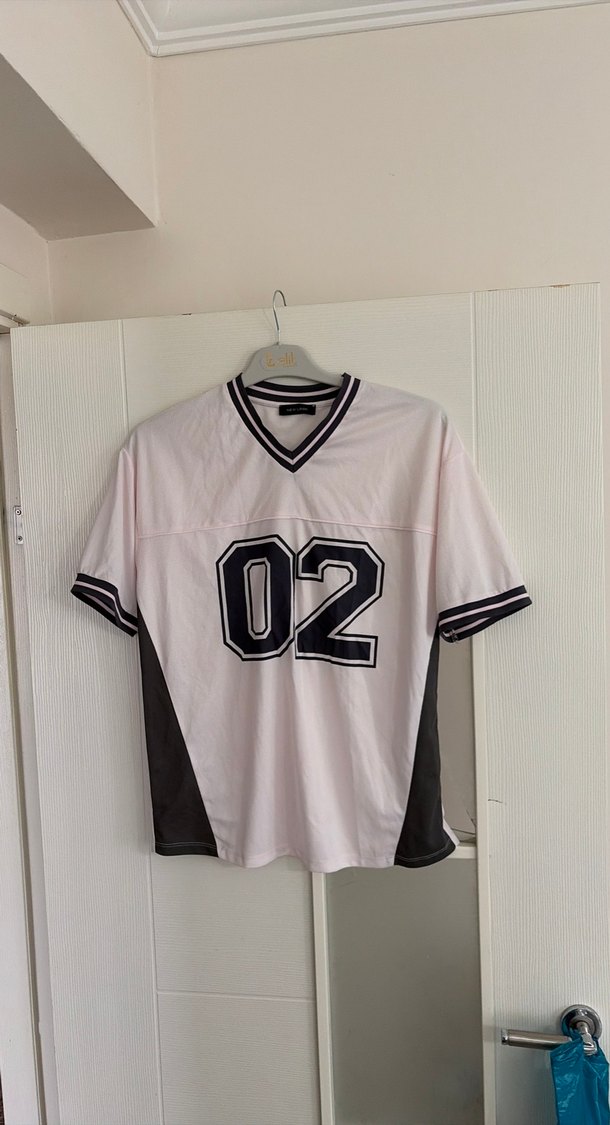 Pastel pembe, kısa kollu, bol kesim ve yuvarlak yakalı tişört. Önünde büyük "02" baskısı ve yanlarda siyah paneller bulunur. Spor ve rahat kombinlere uygun.