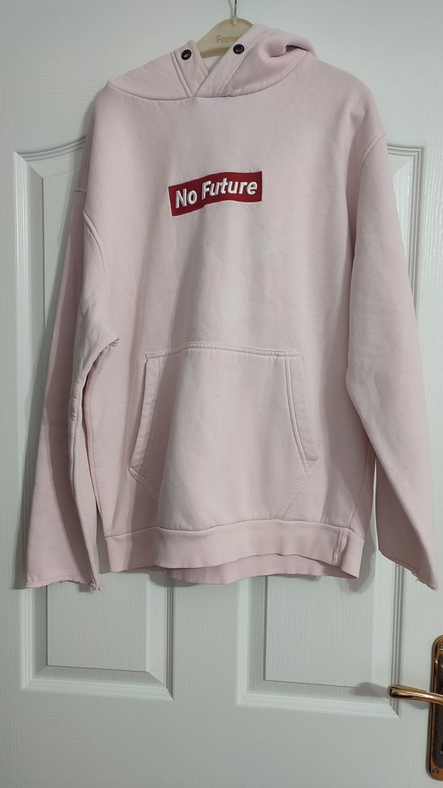 Yumuşak kumaştan, uzun kollu ve kapişonlu pembe oversize kadın sweatshirt. Önünde 'No Future' yazısı bulunur. Günlük kullanıma uygun, rahat ve şık bir tasarım. En 60 boy 71 göründüğü gibi lekeleri vardır