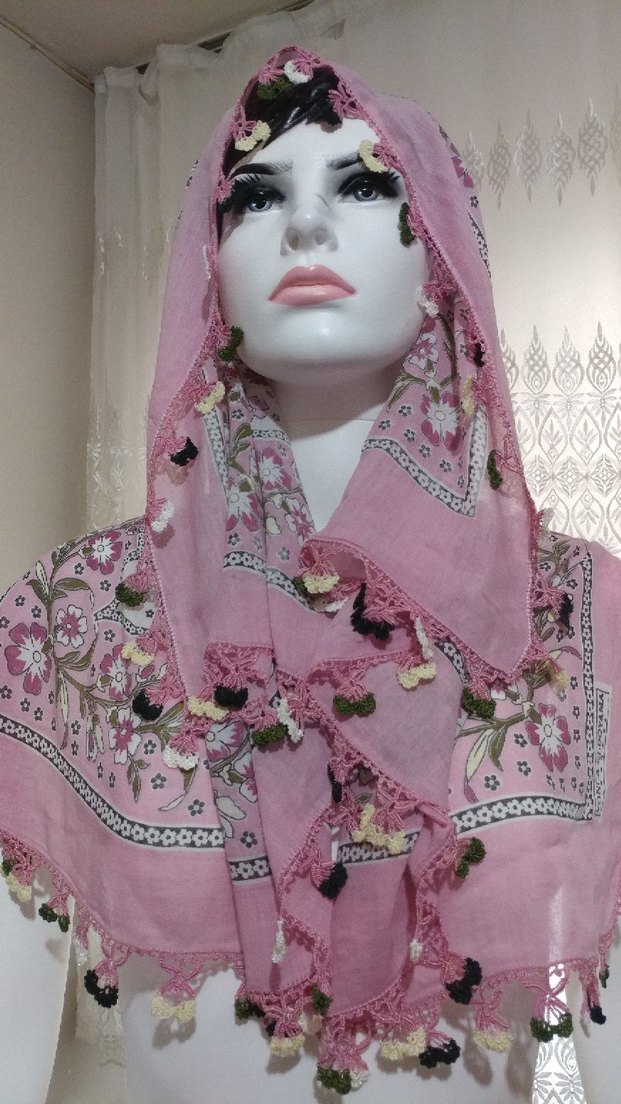 Pastel pembe renkte, tığ oya detaylı ve çiçek desenli, bohem ve retro tarzda yazma Yama ölçüsü 88 cm ( Görsel ve ürün kendime aittir )