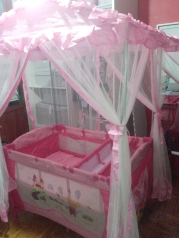 Pastel pembe renkli, tül perdeli yumuşak tavanlı oyun parkı yatak, bebekler için korunaklı ve rahat bir alan sunar. ELDEN TESLIM ISTANBUL USKUDAR