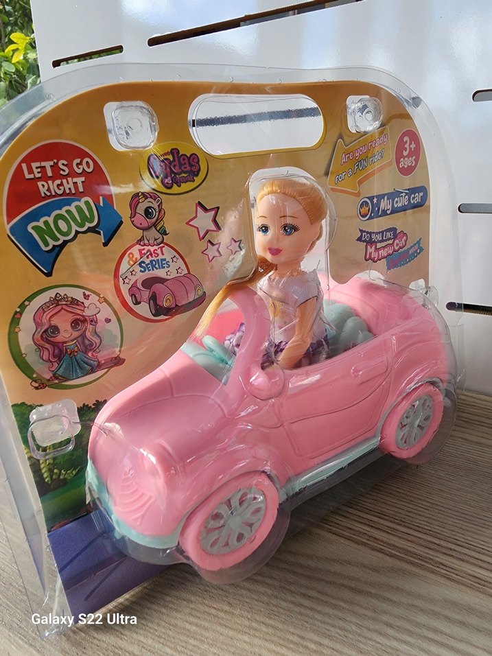 Pastel pembe renkte oyuncak araba içinde oturan bebek ile 3 yaş ve üzeri çocuklar için uygun.