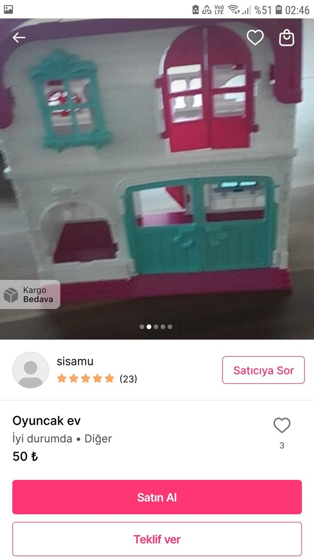 Pastel pembe renkte, çoklu pencere ve kapıya sahip oyuncak ev. İyi durumda ve kargo bedava.