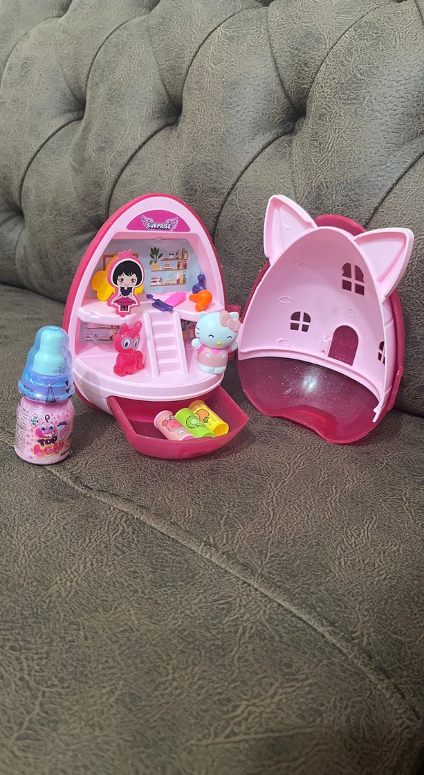 Pembe renkli bu oyuncak set, kulaklı küçük ev, minyatür figürler ve oyuncak biberon içerir. Çeşitli küçük aksesuarlarla oyun imkanı sunar.