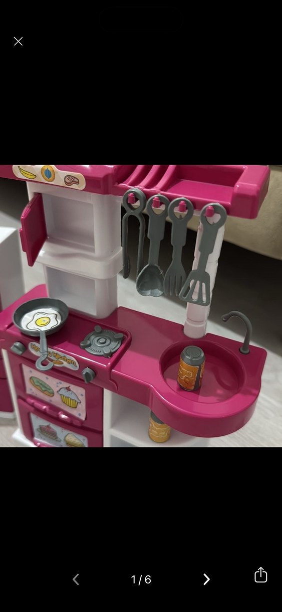 Pembe oyuncak mutfak seti, ocak, lavabo, asılı mutfak gereçleri ve küçük yiyecek aksesuarları içerir.