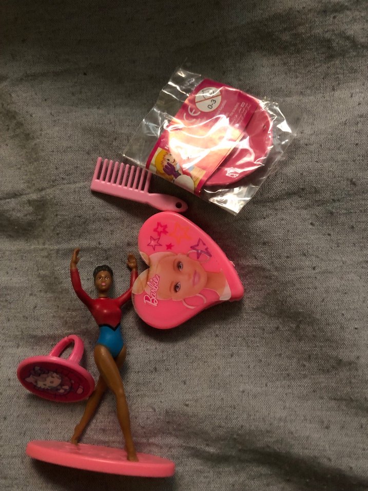 Renkli Barbie bebek, pembe tarak, ayna ve saç aksesuarı ile birlikte sunulur. Ürünlerin hepsi barbie değil