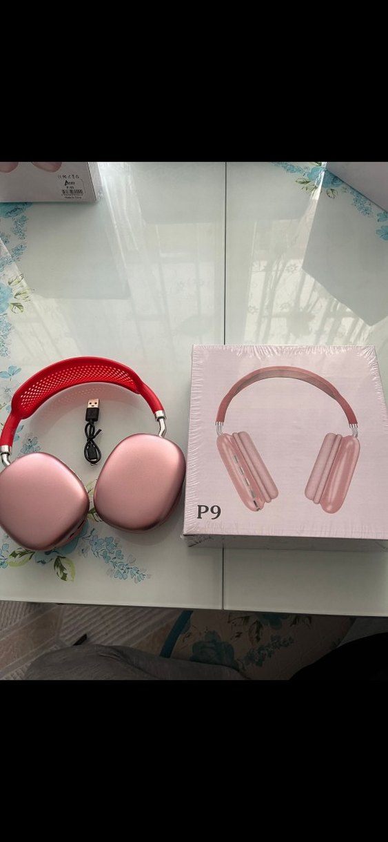 Pastel pembe P9 kablosuz kulaklık, USB şarj kablosu ile birlikte gelir ve uzun süre kullanım için rahat kulak üstü tasarıma sahiptir.