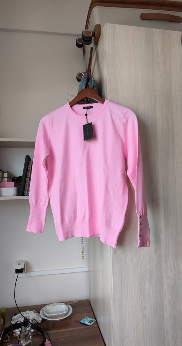 Pamuk kumaştan yapılmış, düğmeli uzun kollu, yuvarlak yakalı ve normal midi boyda, pastel pembe renkli standart beden kazak