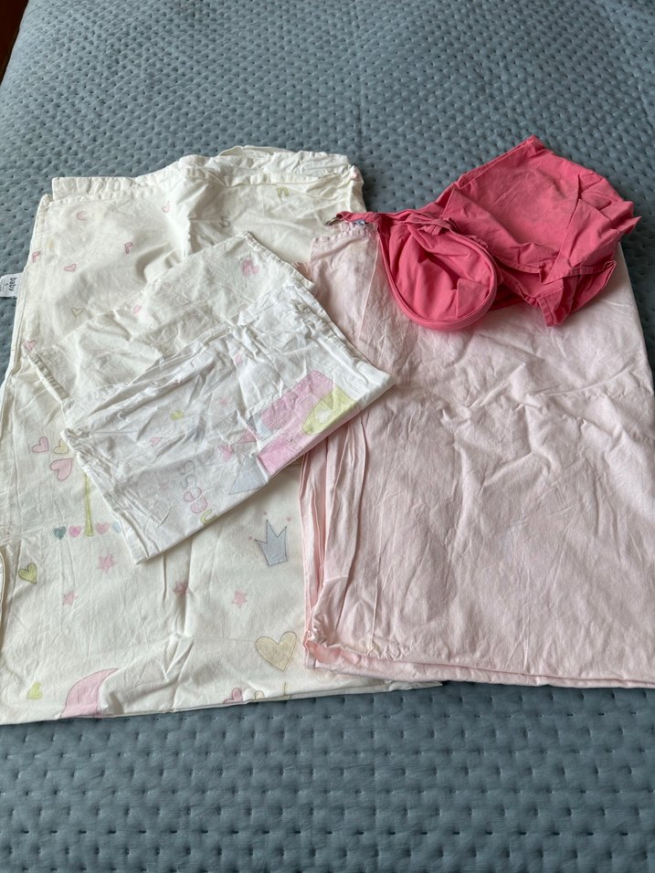Pembe pamuklu çocuk uyku tekstili seti, yastık kılıfı, lastikli çarşaf ve uyku maskesi içerir, yumuşak ve rahat.