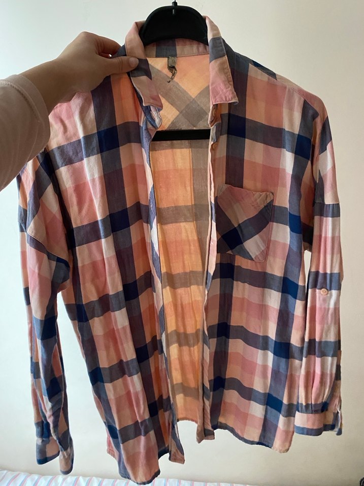 Pamuklu, uzun kollu ve düğmeli, salaş kesim gömlek. Pembe pastel tonlarda, bağlama desenli, günlük rahat sokak stili için uygundur.