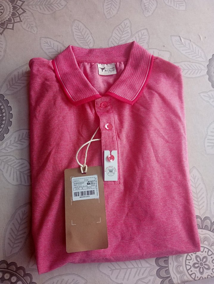 Pamuklu, pastel pembe renkte erkek polo tişört. Kısa kollu, yakalı ve düğmeli, rahat kesimli günlük kullanıma uygun. kısa kollu sıfır ürün