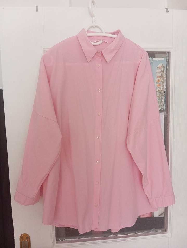 Pastel pembe pamuklu gömlek, uzun kollu, yakalı ve rahat kesimlidir. Düğmeli ve günlük kullanım için uygundur. herhangi bir kusuru yok