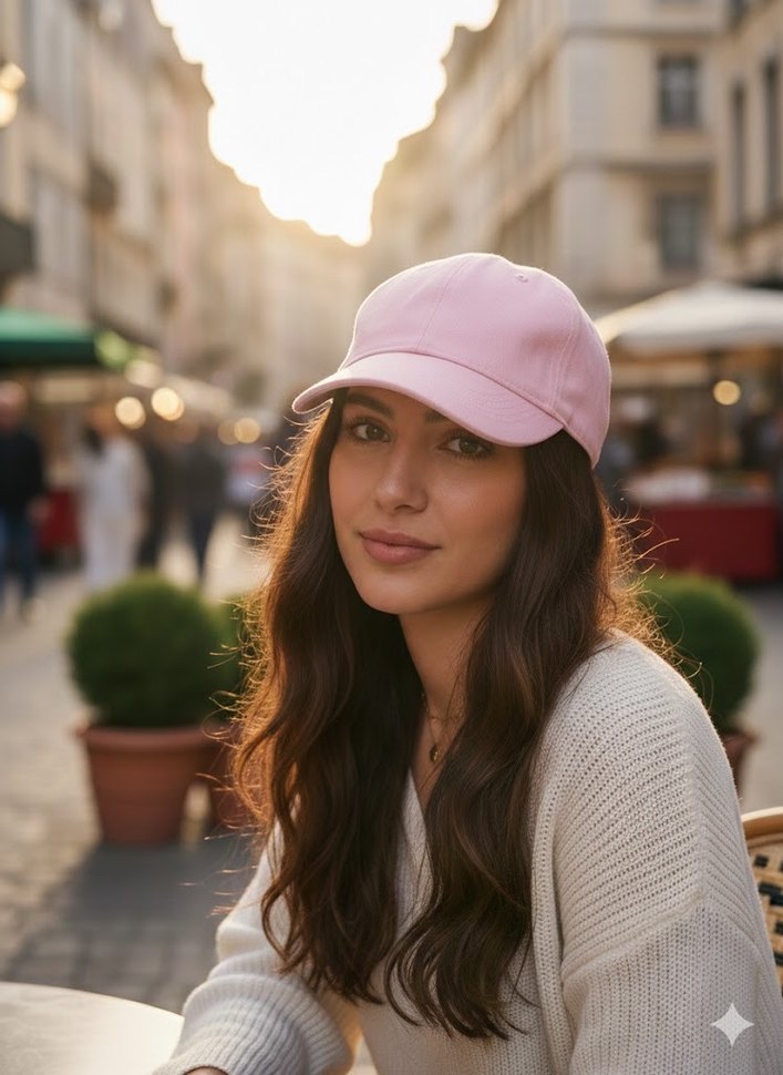 Pastel pembe pamuklu şapka, Paris esintili sokak modasına uygun, zahmetsiz şıklık sunar.