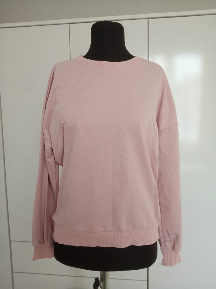 Pastel pembe renkli, yuvarlak yaka ve uzun kollu pamuklu sweatshirt. Rahat, bol kesim ve normal boyda, günlük kullanım için uygun. Effortless chic tarzı yansıtıyor.