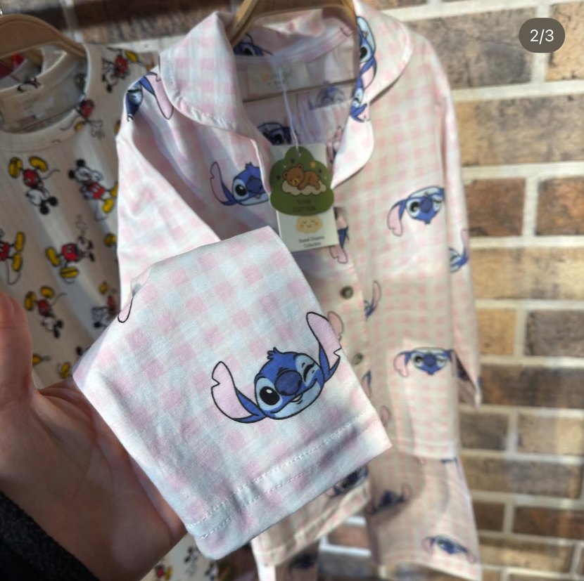 Pastel pembe renkte, uzun kollu, düğmeli ve yakalı pamuklu kız çocuk pijama takımı. Üzerinde Stitch baskıları bulunur. 3-4 yaştan 11-12 yaşa kadar bedenleri vardır
