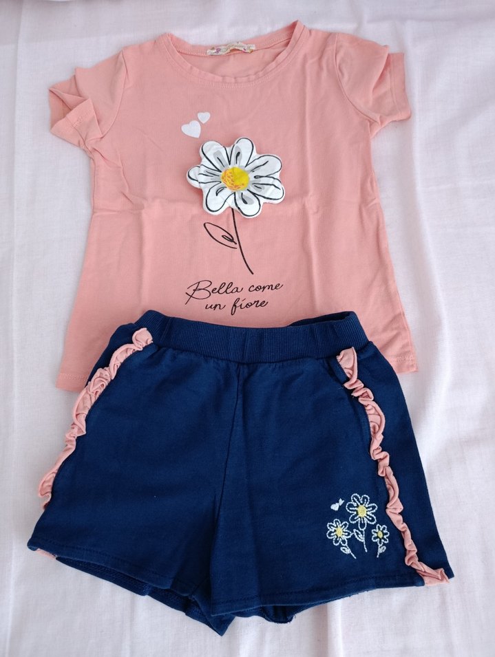 Pembe pamuklu üstü çiçek baskılı ve "Bello come, unfiore" yazılıdır. Lacivert şortları pembe fırfır detaylıdır. Rahat ve şık bir bebek kız takımıdır.