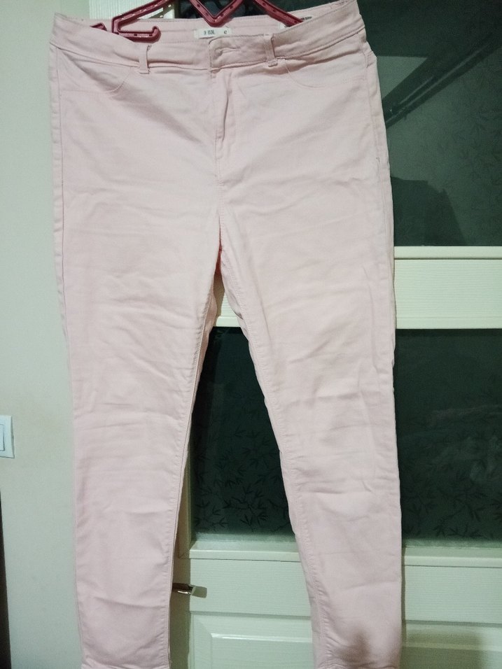 Pembe pastel tonlarında, pamuklu kumaştan, midi boy ve dar kesim kumaş pantolon, minimal ve zahmetsiz şıklık sunar.