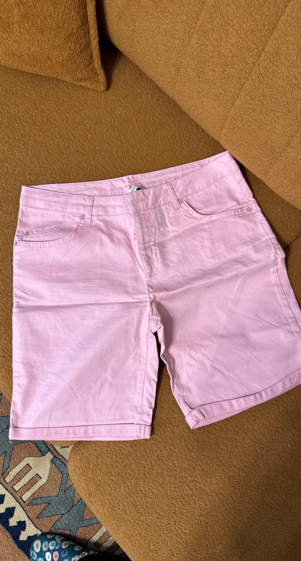 Pembe pastel tonlarda, pamuklu kumaştan rahat kesim Bermuda şort. Düz ve desen içermeyen tasarımıyla günlük ve sokak stiline uygundur.hiç giyilmemiş dolap beklemiştir etiketi yoktur.