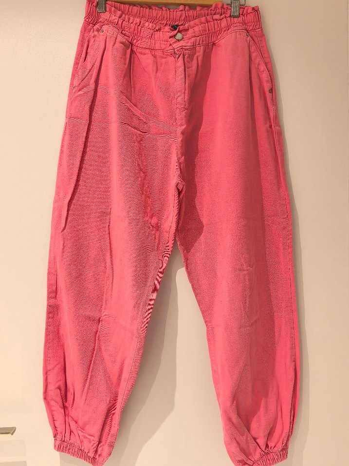 1 kez giydim. İhtiyaç fazlası olduğu için satıyorum. Çok rahat kalıp. %100 pamuktur. Beli lastikli. Yumuşak bir kumaşı var. Çekim sarı ışıkta yapıldı, rengi biraz daha canlı pembedir.Barrels and Oil markadır.