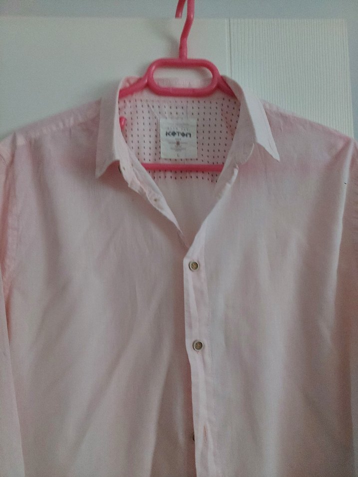 Bu erkek gömlek, yakalı ve düğmeli ön detaylara sahiptir. Pastel pembe renkte, yumuşak pamuk kumaştan üretilmiş, uzun kollu ve normal kesimdir. Günlük kullanıma uygundur.