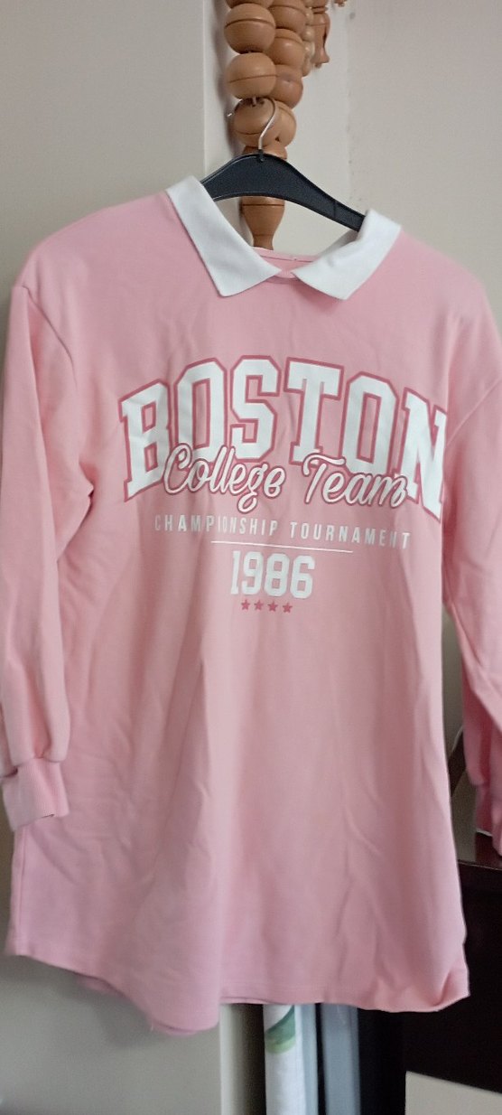 Pembe pamuklu, uzun kollu, baskılı yazılı ve düğmeli detaylı bol kesim sweatshirt. Spor ve sokak tarzı rahat giyim için uygun.