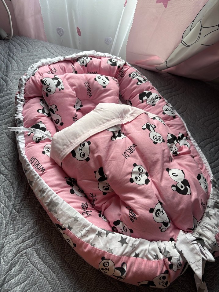 Pembe panda desenli, yumuşak ve sıcak kumaştan yapılmış anne yanı yatağı . Uyku sırasında rahatlık sağlar.