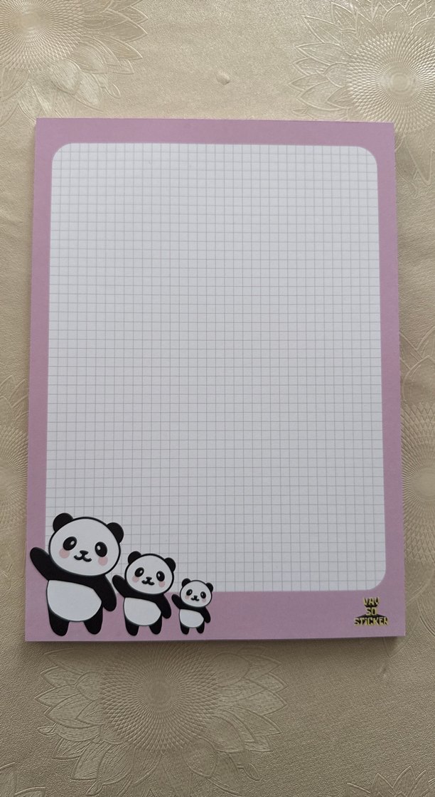 Pastel pembe renkte, kapakta sevimli panda figürleri olan kareli defter. Notlar ve çizimler için uygundur. A5 boyutunda