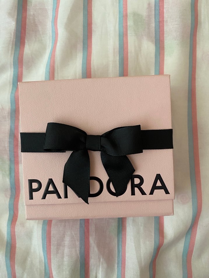 Pastel pembe renkte Pandora kutusu, üzerinde siyah kurdele fiyonk bulunuyor. Kutunun önünde Pandora logosu yer alıyor.