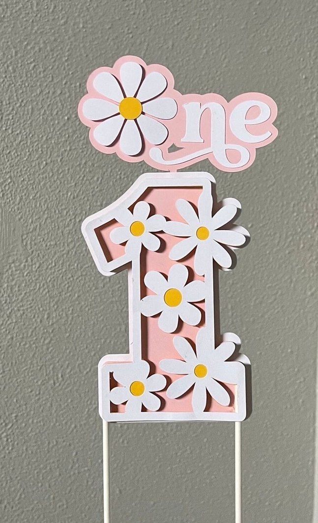 Pembe pastel renkte, beyaz papatyalar ve cursive 'one' yazısıyla süslenmiş 1 rakamı şeklinde parti süsü.