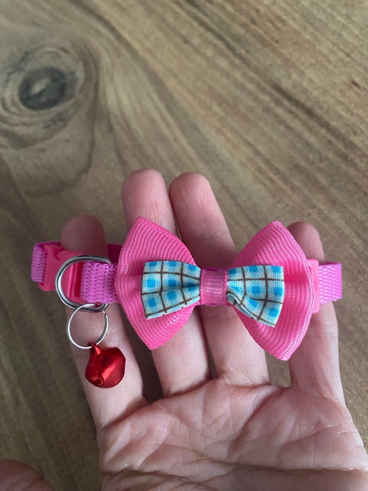 Renkli papyon ve küçük kırmızı çanlı pembe kedi tasması.