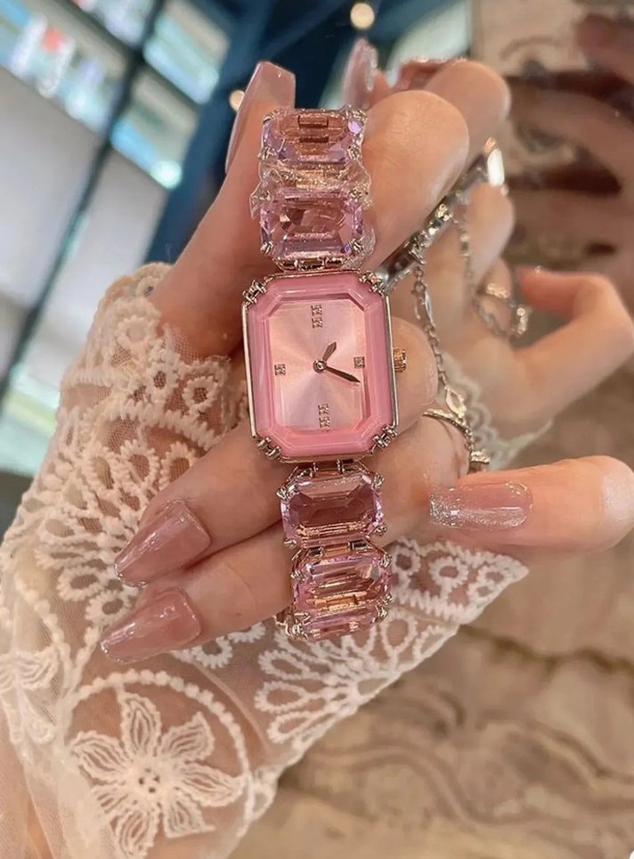 Pastel pembe, parıltılı taşlarla süslenmiş, dikdörtgen kadranlı ve taş görünümlü bilezikli kadın kol saati. ⌚
