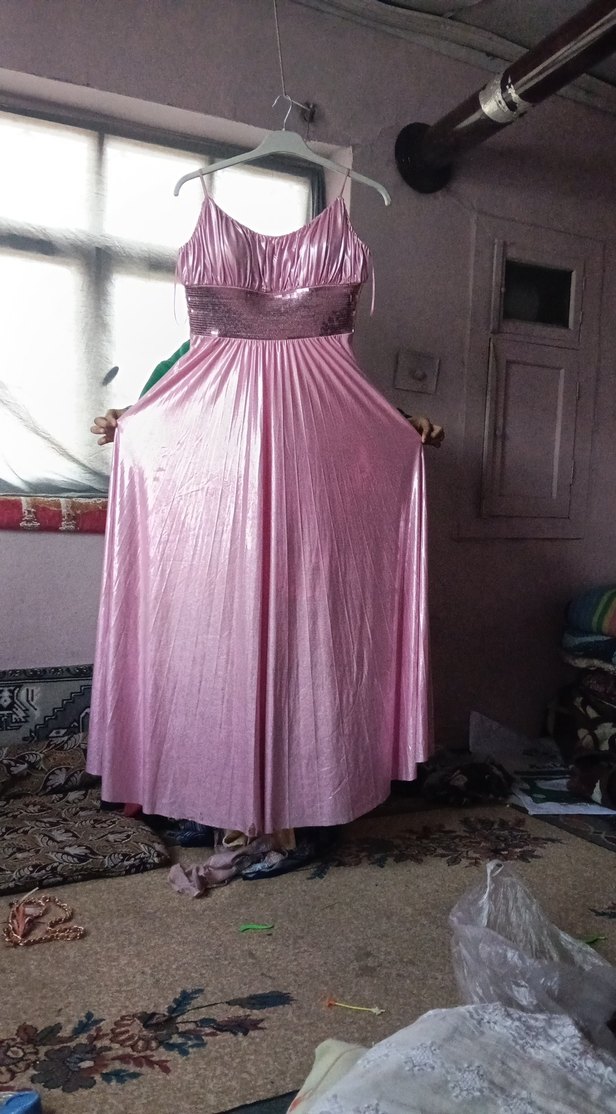 Pembe Parlak Askılı Uzun Elbise