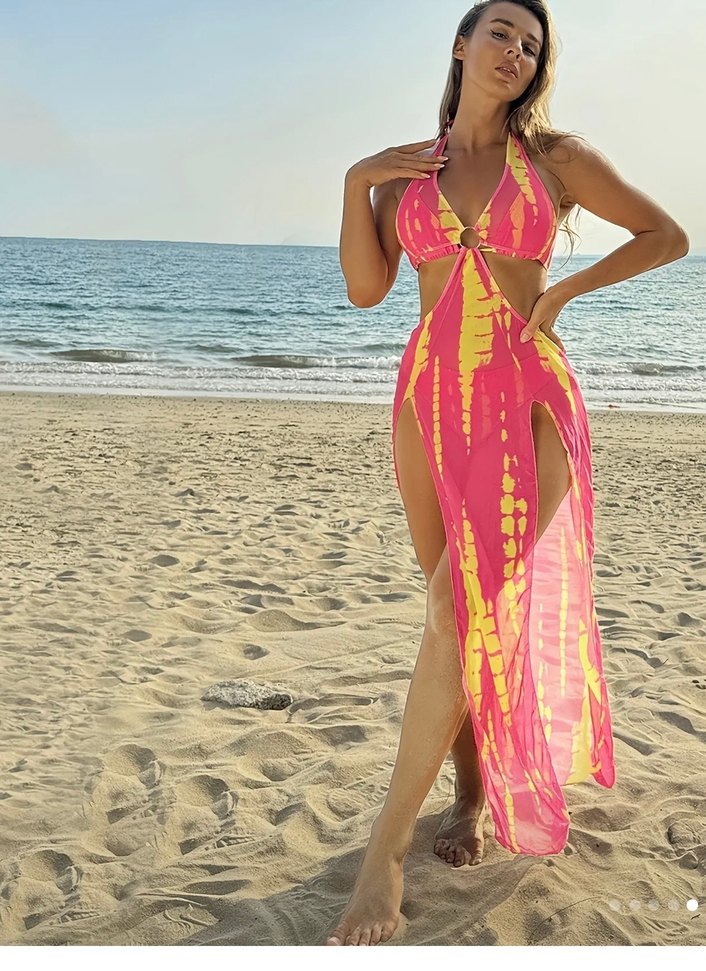 Parlak pembe ve sarı tie-dye desenli, bağlamalı uzun ve vücuda oturan kadın monokini, drapeli detaylar ve ince askılarla plaj için ideal.