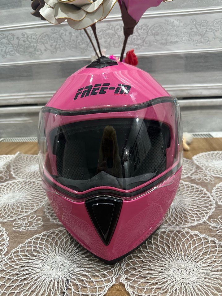 Parlak pembe renkli, baskılı desenli plastik biker motosiklet kaskı. Tam yüz koruması için şeffaf vizöre sahiptir. ️biraz aşınma var iç kısımda dışardan görünmüyor