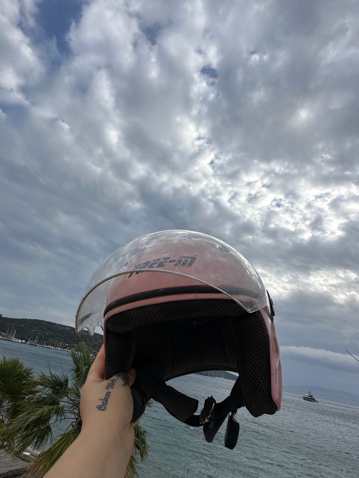 Pembe parlak yüzeye sahip motosiklet kaskı, cam vizör ve tokalı kapanışıyla minimalist rock punk tarzını yansıtıyor. ️