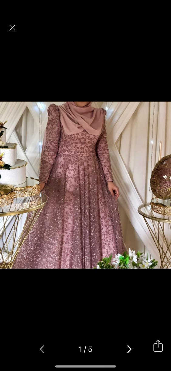 Pembe renkli, parlak çiçek desenli uzun abiye elbise. Kayık yaka ve uzun kollu, drapeli ve rahat kesimlidir, mütevazı ve gösterişli duruş sağlar. ✨