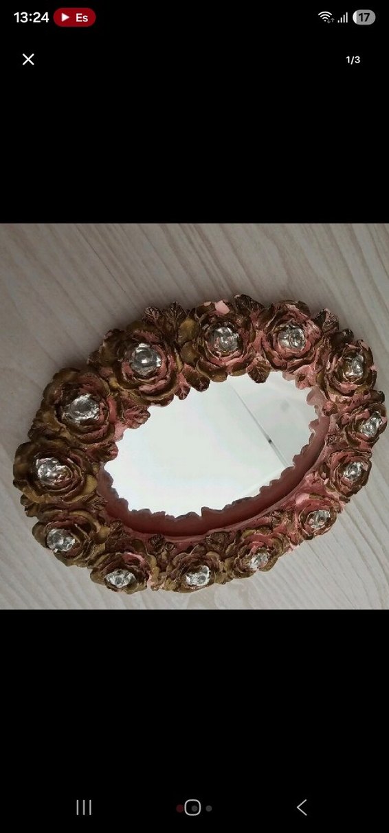 Pembe parlak çerçevesi ve detaylı çiçek desenleriyle süslenmiş dekoratif ayna, mekana şıklık katar.