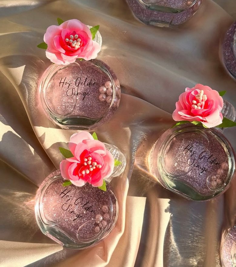 Pembe parlak cam kaplarda, dekoratif çiçek ve inci detayları bulunan 'Hoş Geldin Sürpriz' yazılı hoş geldin hediyesi.