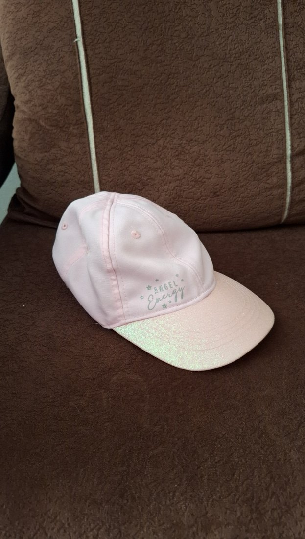 Pastel pembe renkli, parlak siperlikli, yumuşak kumaştan çocuk şapkası, trend sokak stili için uygun.