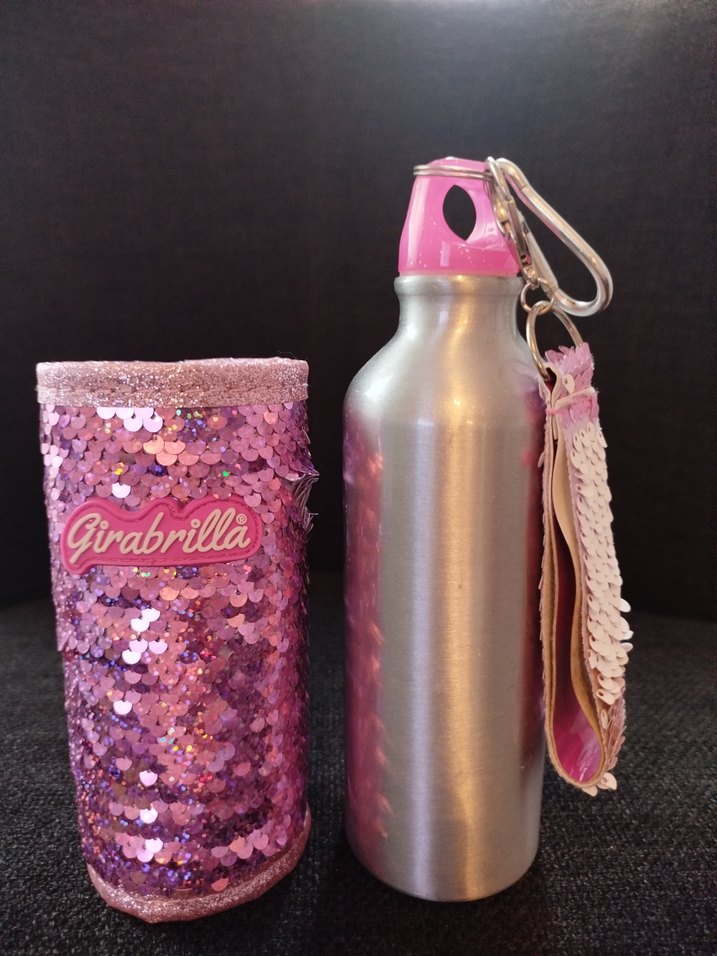 Parlak pembe çocuk termos şişesi, pullu kılıf ve taşıma askısı ile birlikte gelir. Üzerinde Girabrilla markası bulunur.