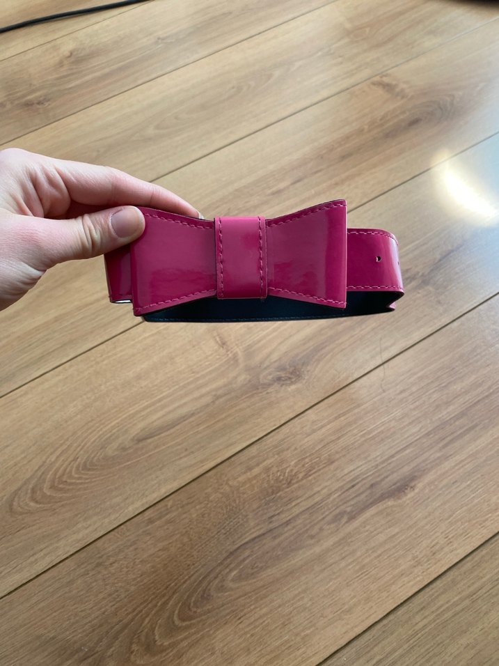 Pembe parlak deri ve fiyonk detaylı çocuk kemeri. Boyu 78 cm. Hiçbir sorunu yok göründüğü gibidir.