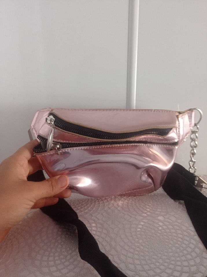 Pembe parlak deri çapraz çanta, fermuarlı bölmeler ve ayarlanabilir siyah kayış ile günlük kullanıma uygundur.