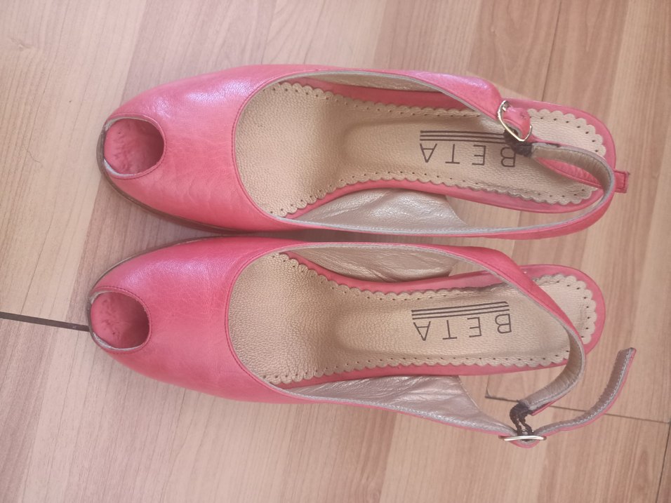 Parlak pembe deri malzemeden yapılmış, dolgu topuklu ve tokalı kadın klasik ayakkabılar. Vintage ve çağdaş tarzı birleştirir, romantik akşamlar için uygundur. yaklaşık 8-9 cm civarında