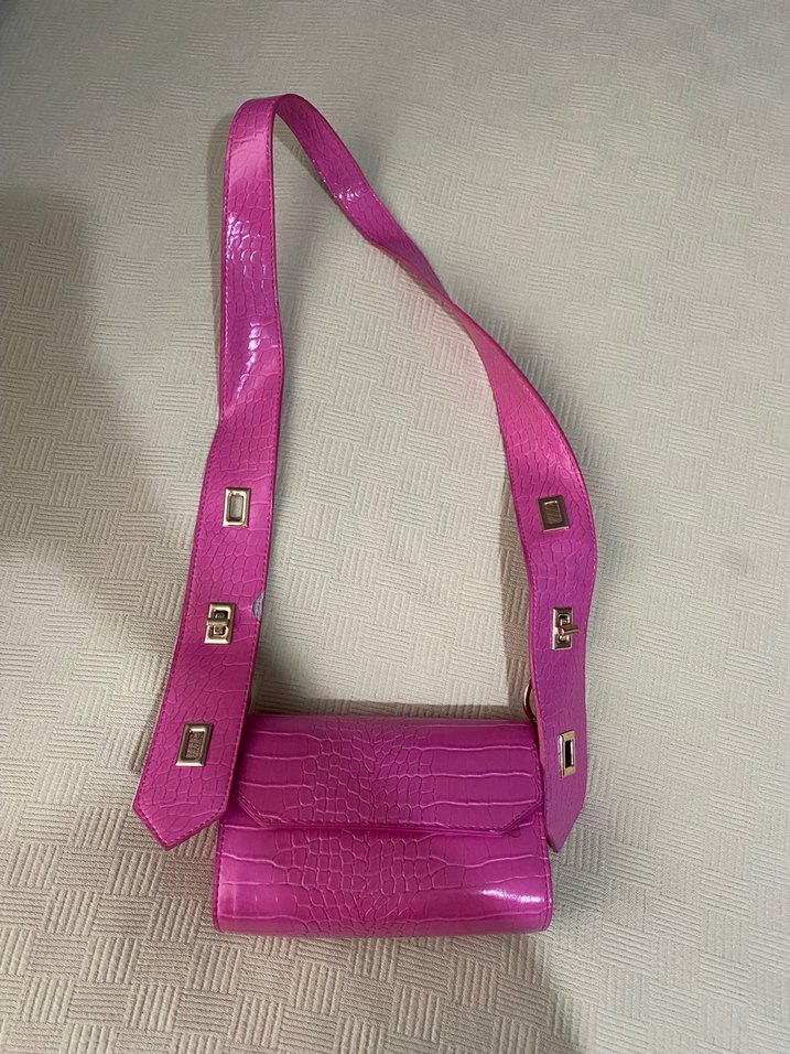 Parlak pembe deri yılan desenli, tokalı kadın çantası. Sokak modasına uygun şık bir tasarım.