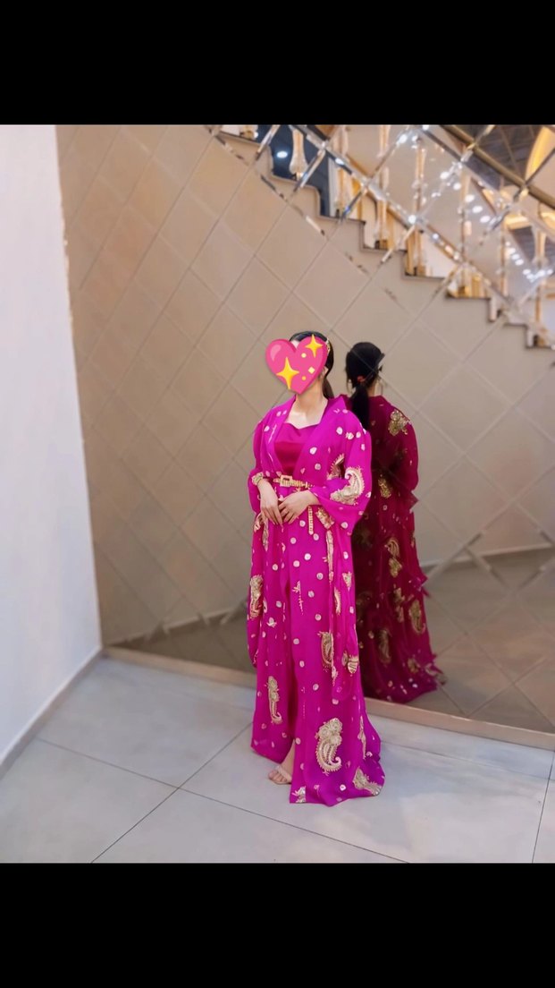 Pembe renkli, desenli ve parlak kumaştan yapılmış bu uzun elbise, V yakalı ve drapeli olup, bol kesim ve uzun kolludur. Düğünler için uygundur.