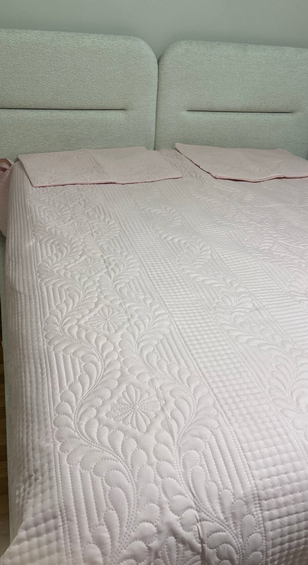 pembeparlak yüzeye sahip, detaylı dikiş desenleriyle yatak odanıza şıklık ve dokunuş katan yatak örtüsü. ️